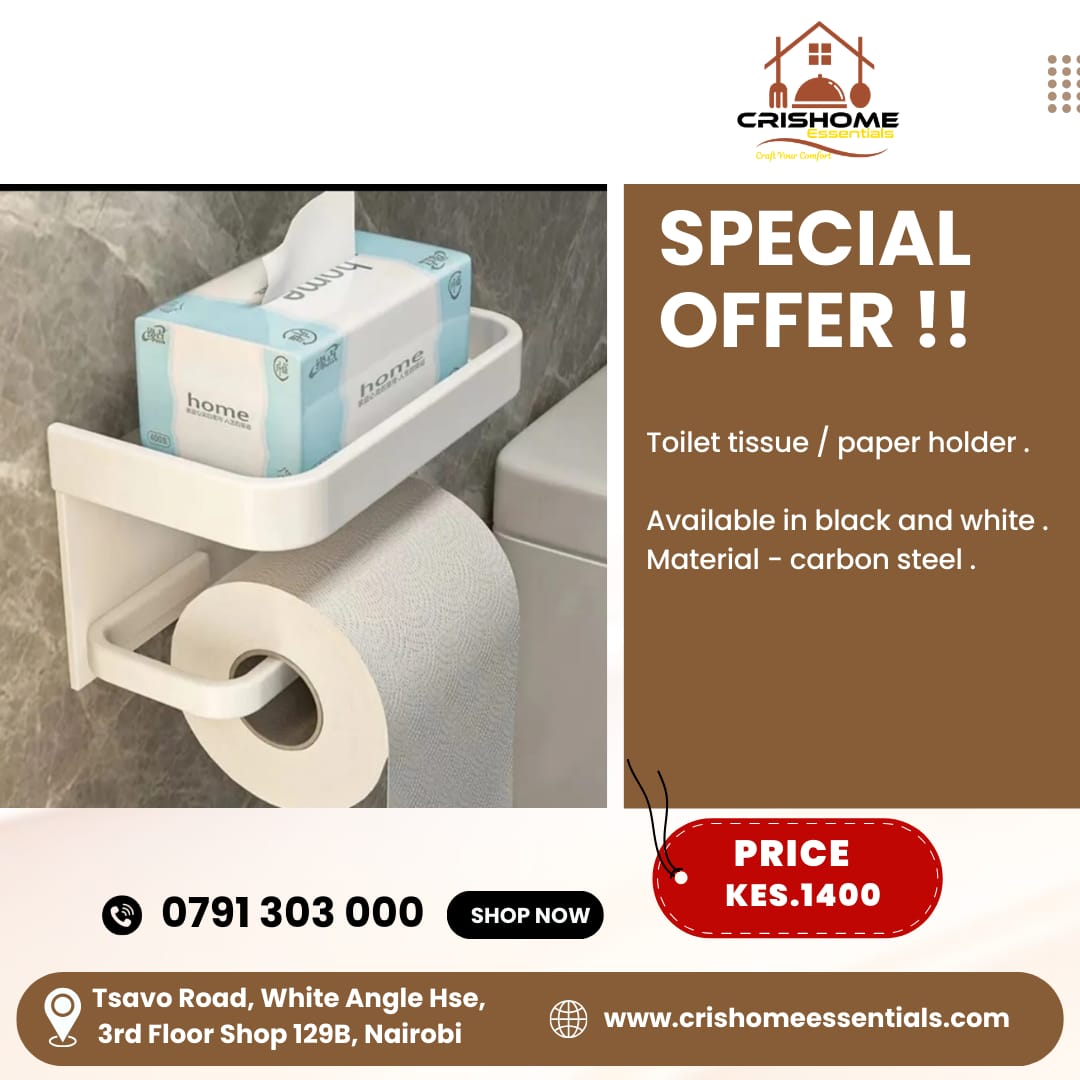 Shop the Toilet Tissue/Paper Holder at CrisHome Essentials. Made from durable carbon steel and available in black and white. Wear-resistant, versatile design keeps toilet paper organized and accessible. Easy installation with glue or screws. Perfect modern bathroom storage solution.