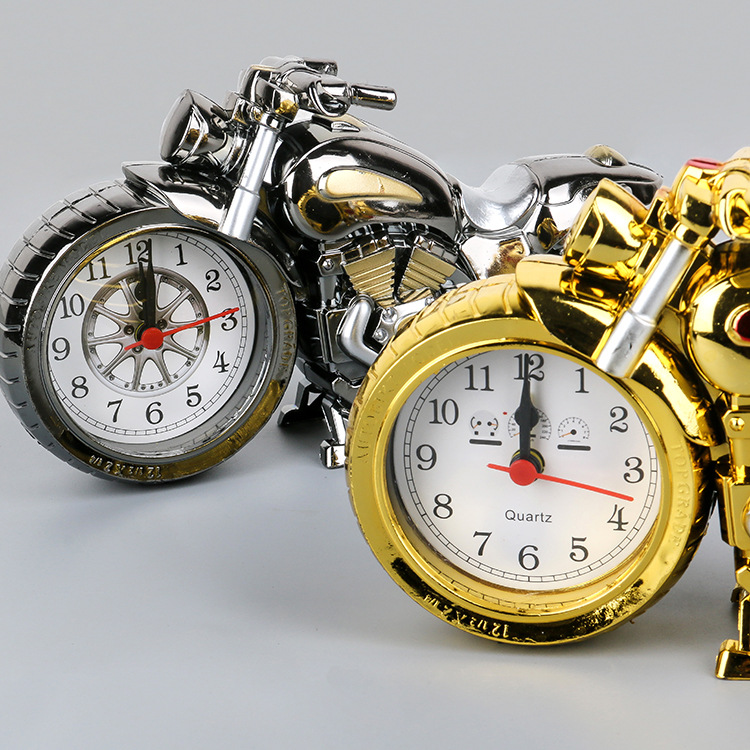 A charming, retro motorcycle-shaped alarm clock—available in gold or silver, ideal for stylish bedside décor and practical morning reminders.