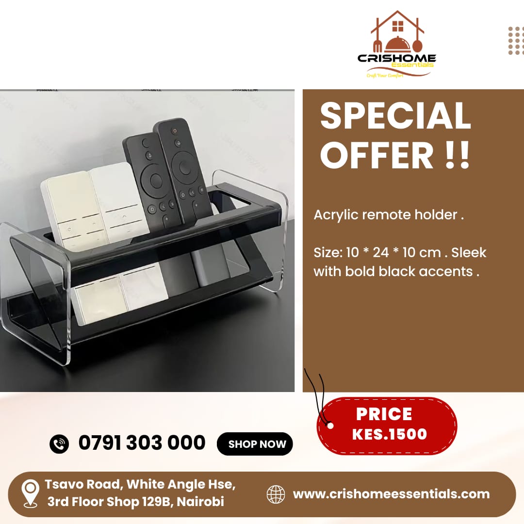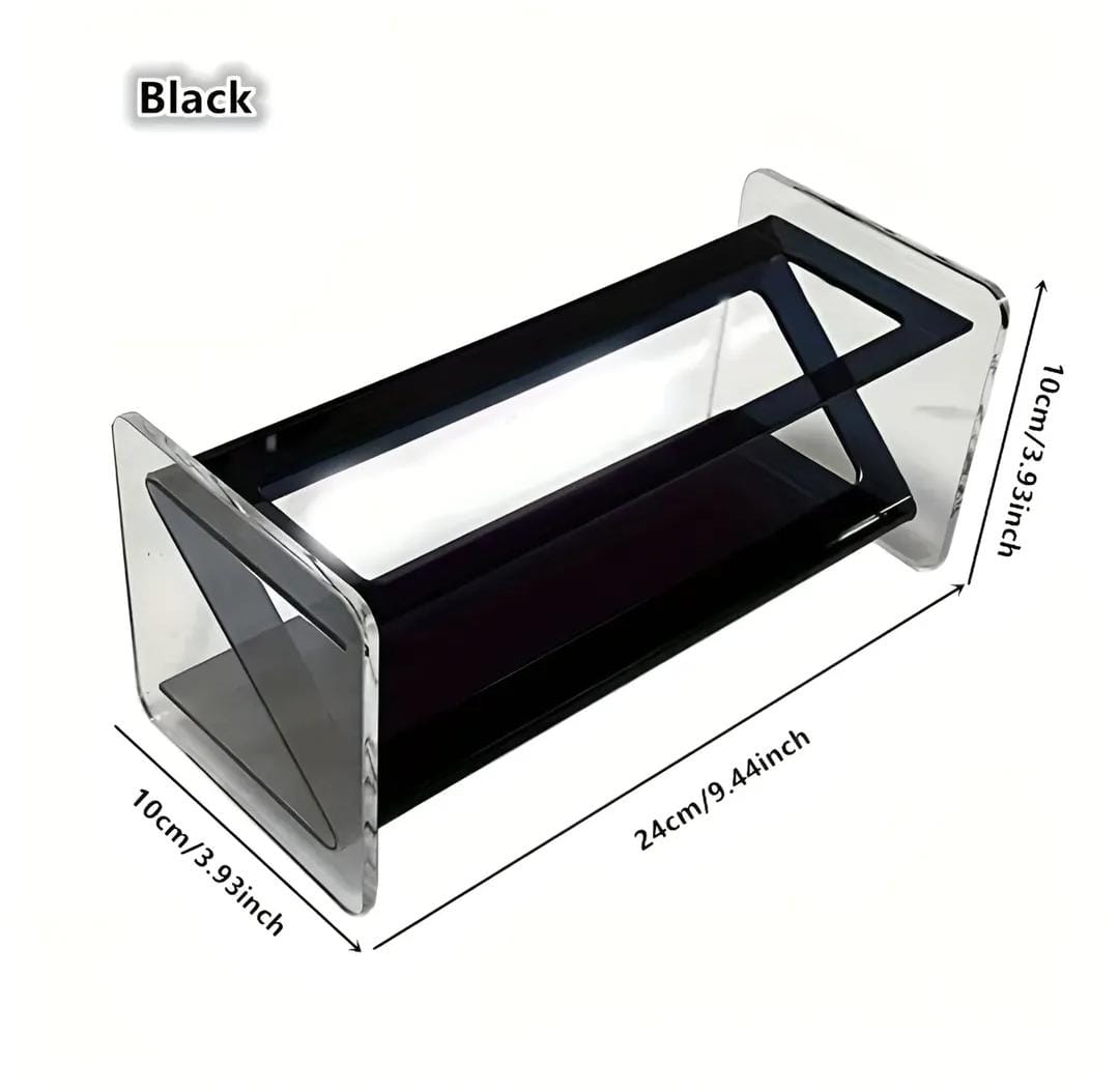 Keep your living space tidy with the sleek Acrylic Remote Holder, a modern organizer designed to keep your remotes and small accessories neatly arranged. Made from clear acrylic with bold black accents, this holder adds a stylish touch to coffee tables, TV stands, or office desks.