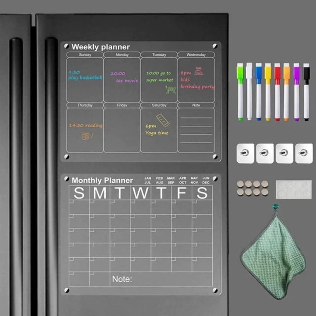 Stay organized in style with the 2 Pcs Set Magnetic Monthly/Weekly Fridge Planner. Made from premium acrylic, this planner set is perfect for managing your weekly or monthly tasks, meal plans, or family schedules—all right from your fridge. The punch-free magnetic backing makes installation effortless, and the included accessories make it a complete organization solution.